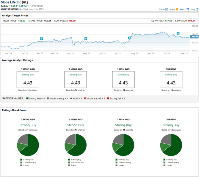 Among the 14 Wall Street analysts covering Globe Life’s stock, the consensus is a “Strong Buy.” That’s based on nine “Strong Buy” ratings, two “Moderate Buys,” and three “Holds.” The ratings configuration has remained the same over the past three months.