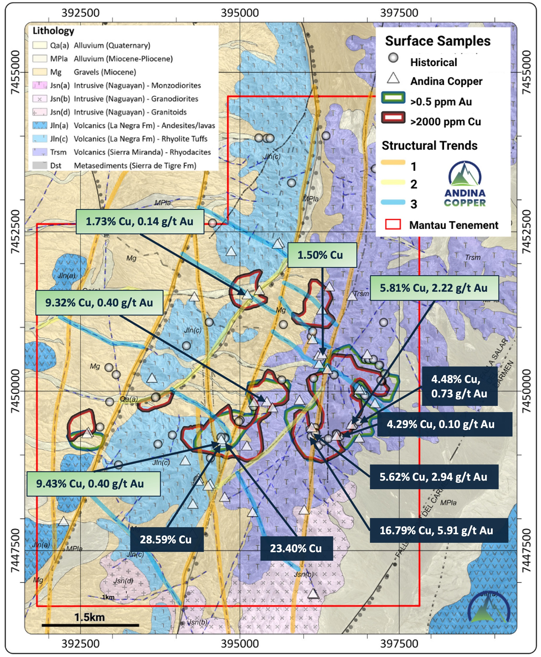 Recent sampling by Andina Copper has confirmed the strength, location, and continuity of key copper-gold anomalies previously identified in historical work. The main mineralized zones occur within rhyolitic tuffs in the central and southeastern portions of the Mantau concessions, where copper and gold are hosted along faults, veins, and narrow structural zones.